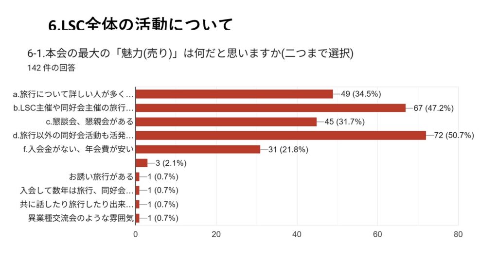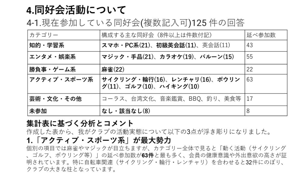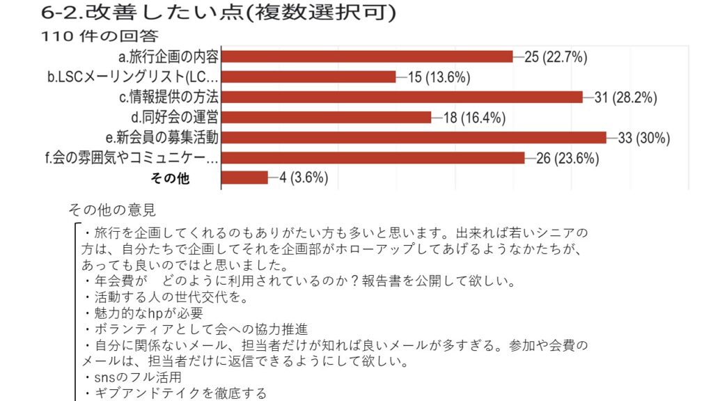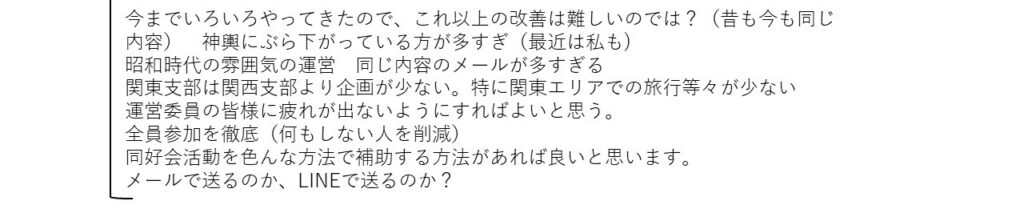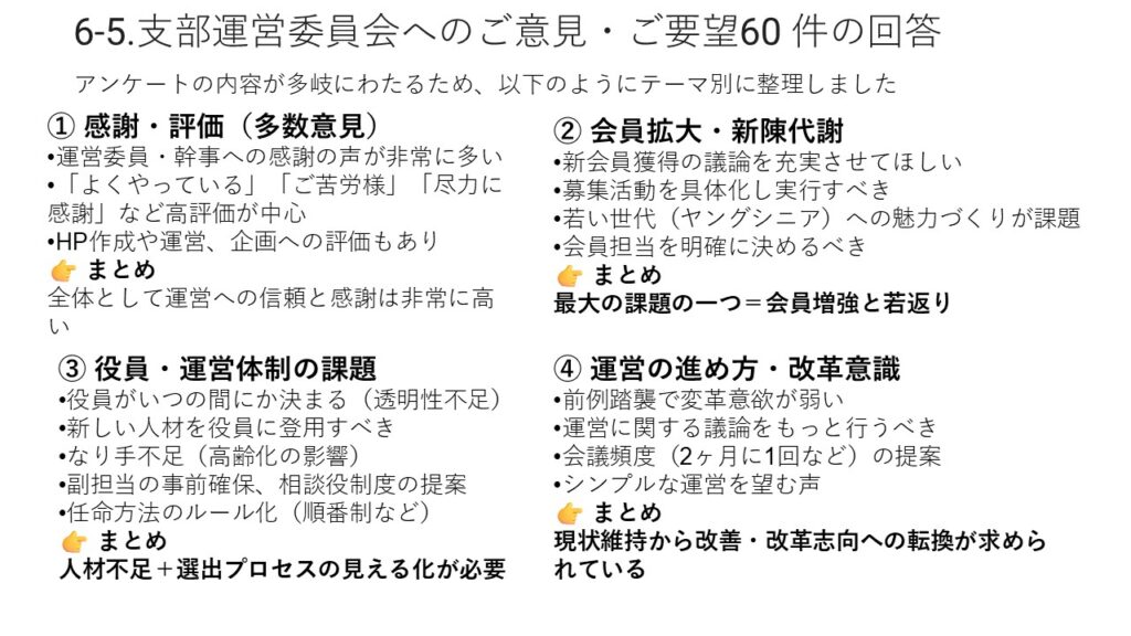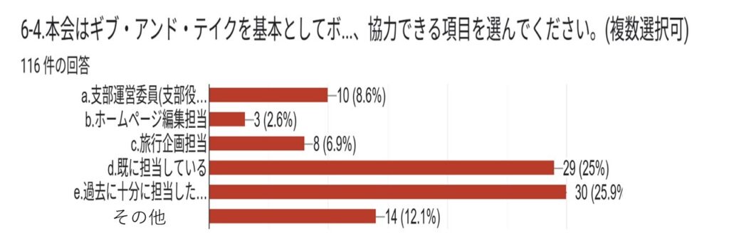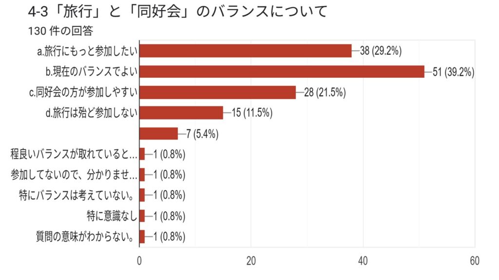 本結果は、今後の支部運営や旅行企画、ホームページ運営、各同好会活動などに活かし、具体的な行動計画へと繋げて頂きます。会員の皆さまにおかれましても、本結果をご覧いただき、会の発展に向けて引き続きご協力をお願い申し上げます。