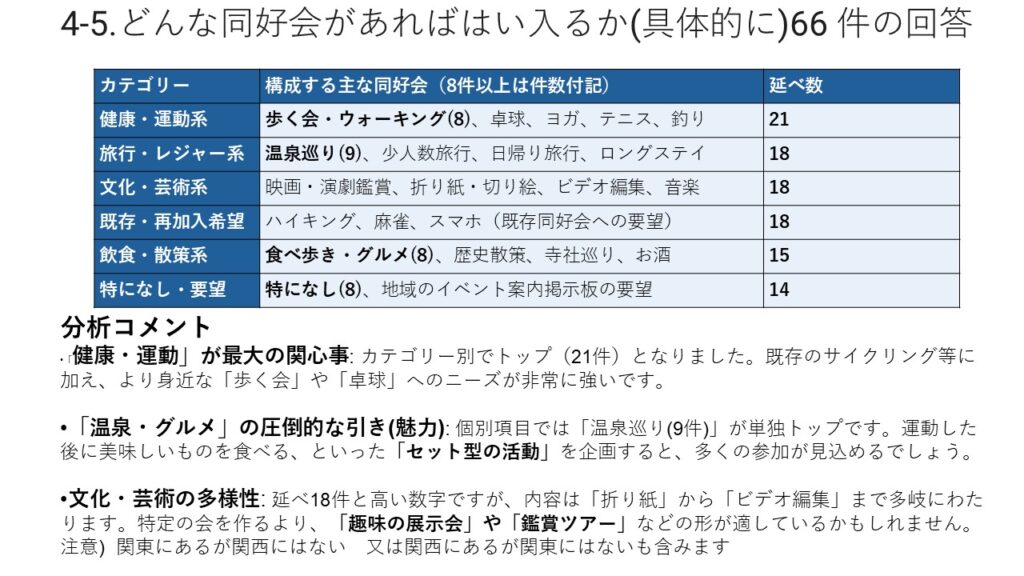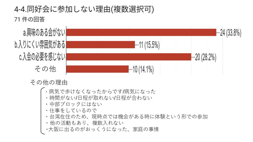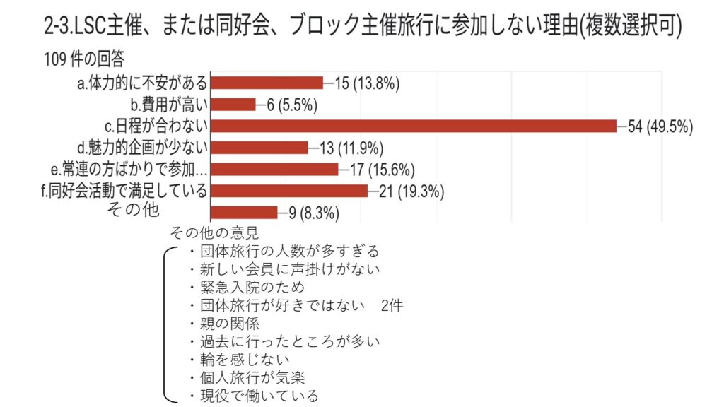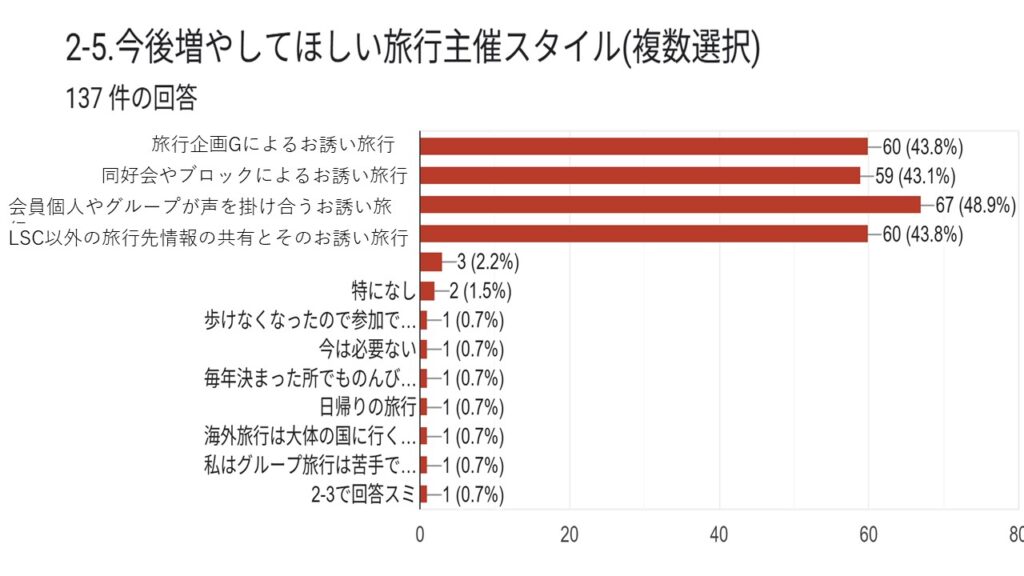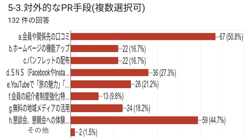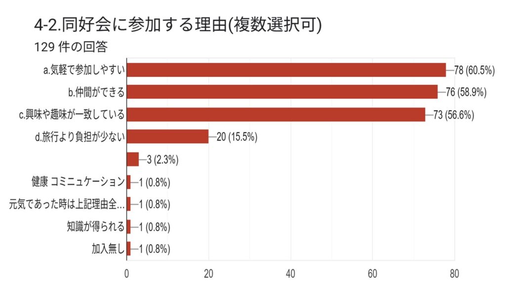 本結果は、今後の支部運営や旅行企画、ホームページ運営、各同好会活動などに活かし、具体的な行動計画へと繋げて頂きます。会員の皆さまにおかれましても、本結果をご覧いただき、会の発展に向けて引き続きご協力をお願い申し上げます。