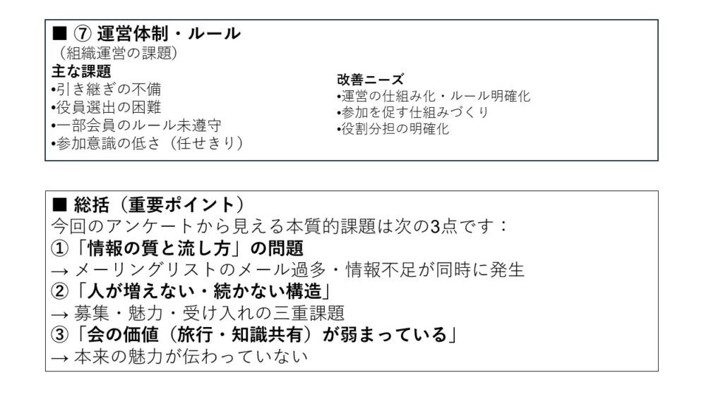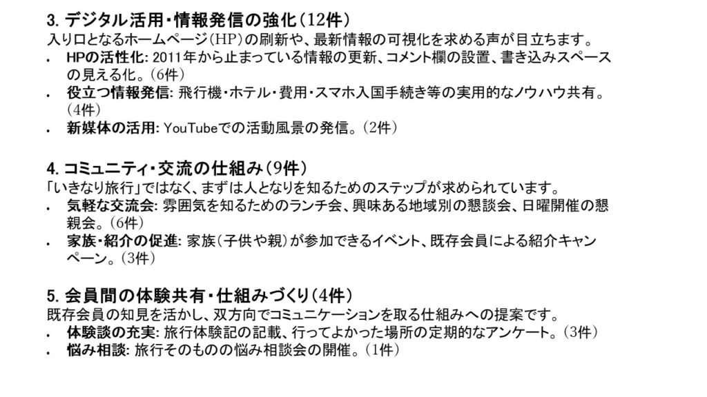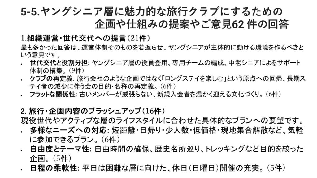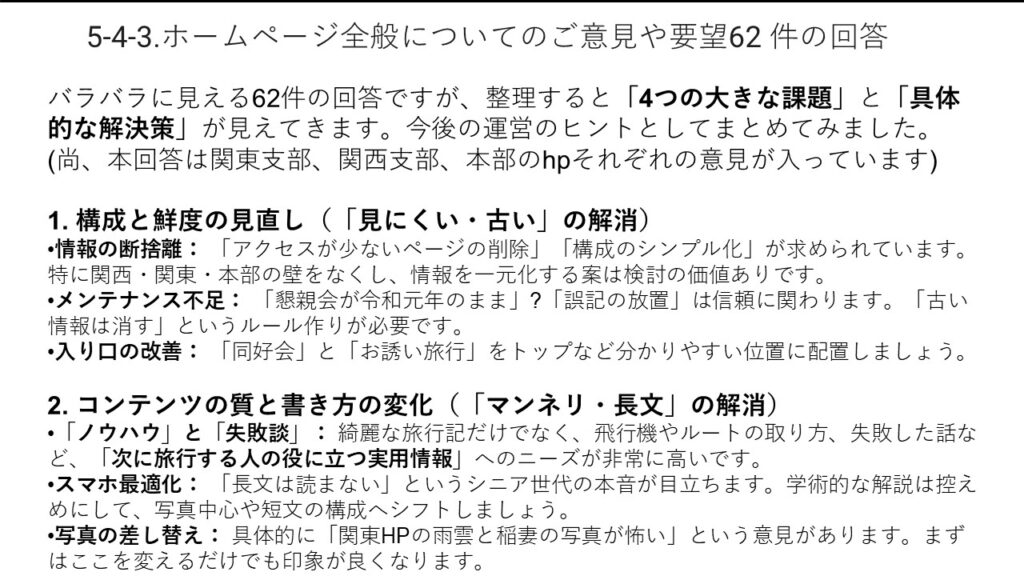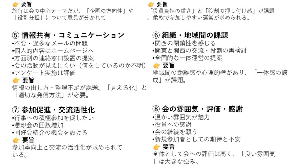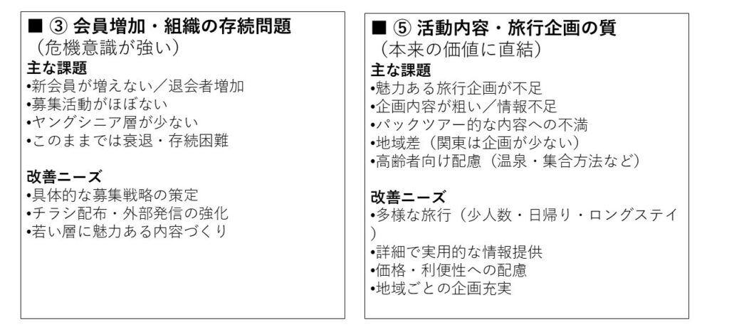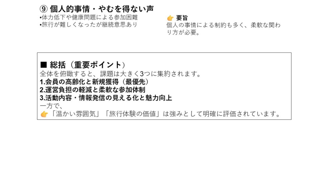 本アンケートでは、会員の旅行に関する実態や、当会が抱える三つの課題(会員減少・高齢化・活動のマンネリ化)、さらに運営全般について、多くの貴重なご意見をお寄せいただきました。会の現状に対する強い危機感も共有されていることが明らかになりました。