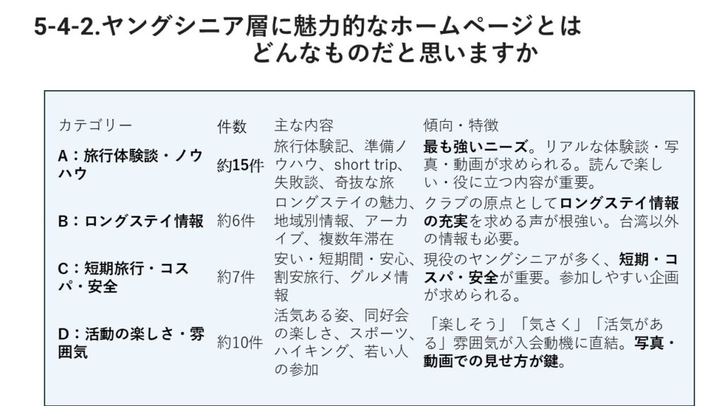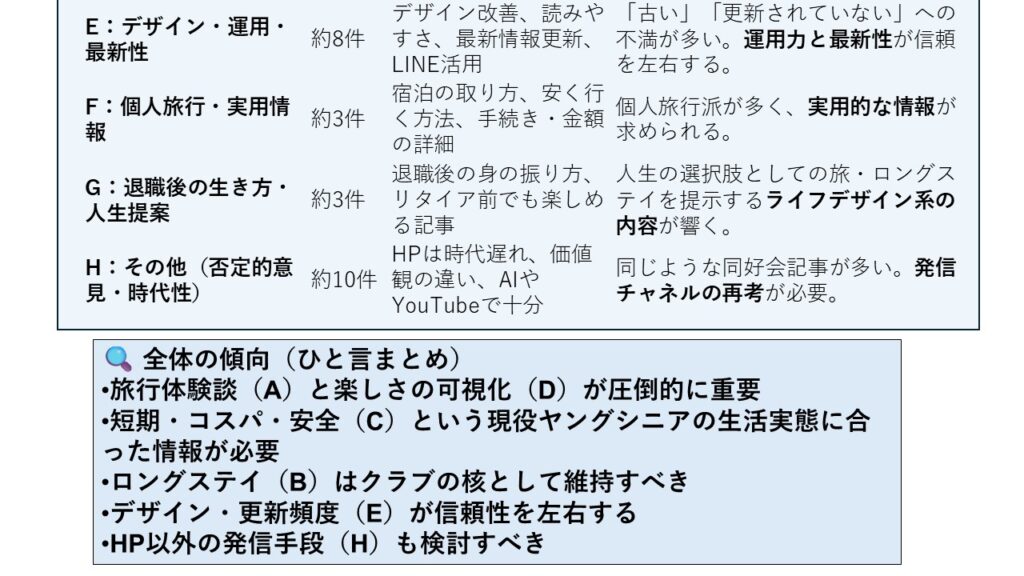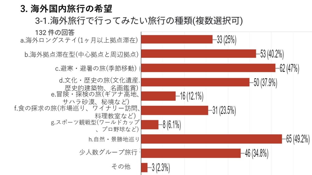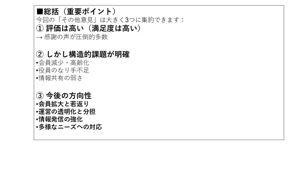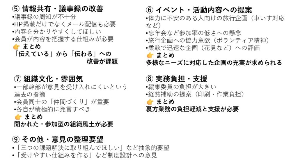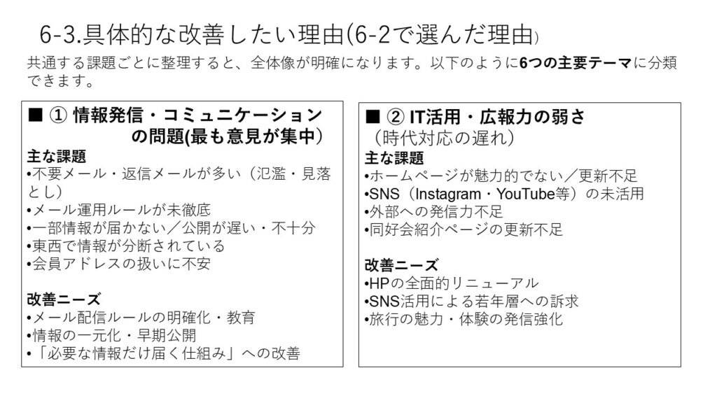 本アンケートでは、会員の旅行に関する実態や、当会が抱える三つの課題(会員減少・高齢化・活動のマンネリ化)、さらに運営全般について、多くの貴重なご意見をお寄せいただきました。会の現状に対する強い危機感も共有されていることが明らかになりました。