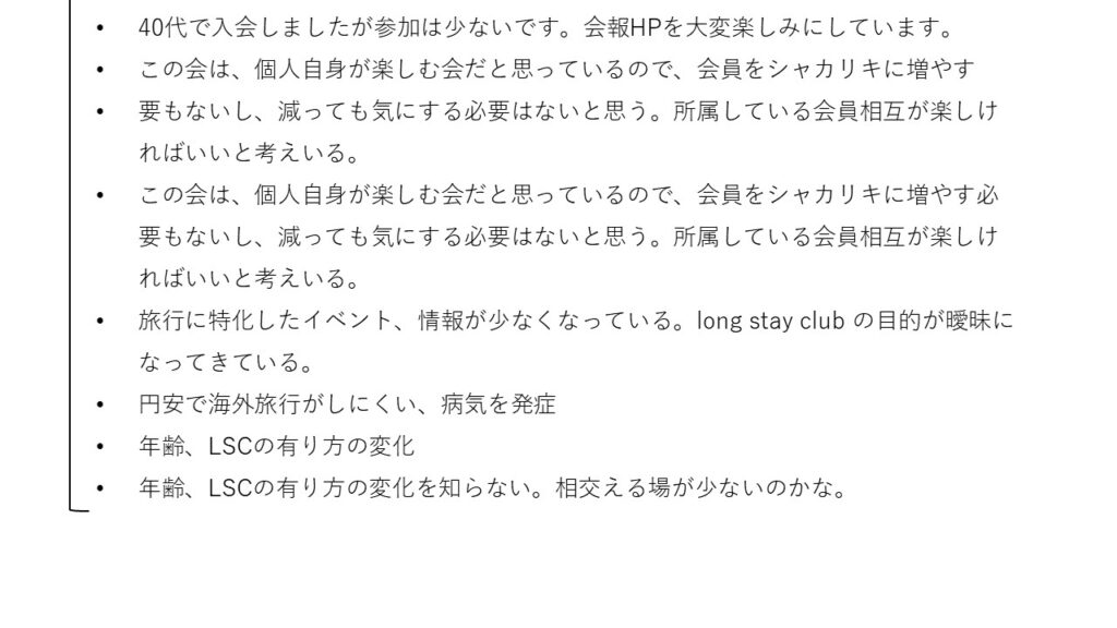 最後までご覧いただき有難うございました。会員のご協力あってこそのアンケート結果です。これからも共に魅力ある会を創っていけれは幸せです。引き続きよろしくお願いします。